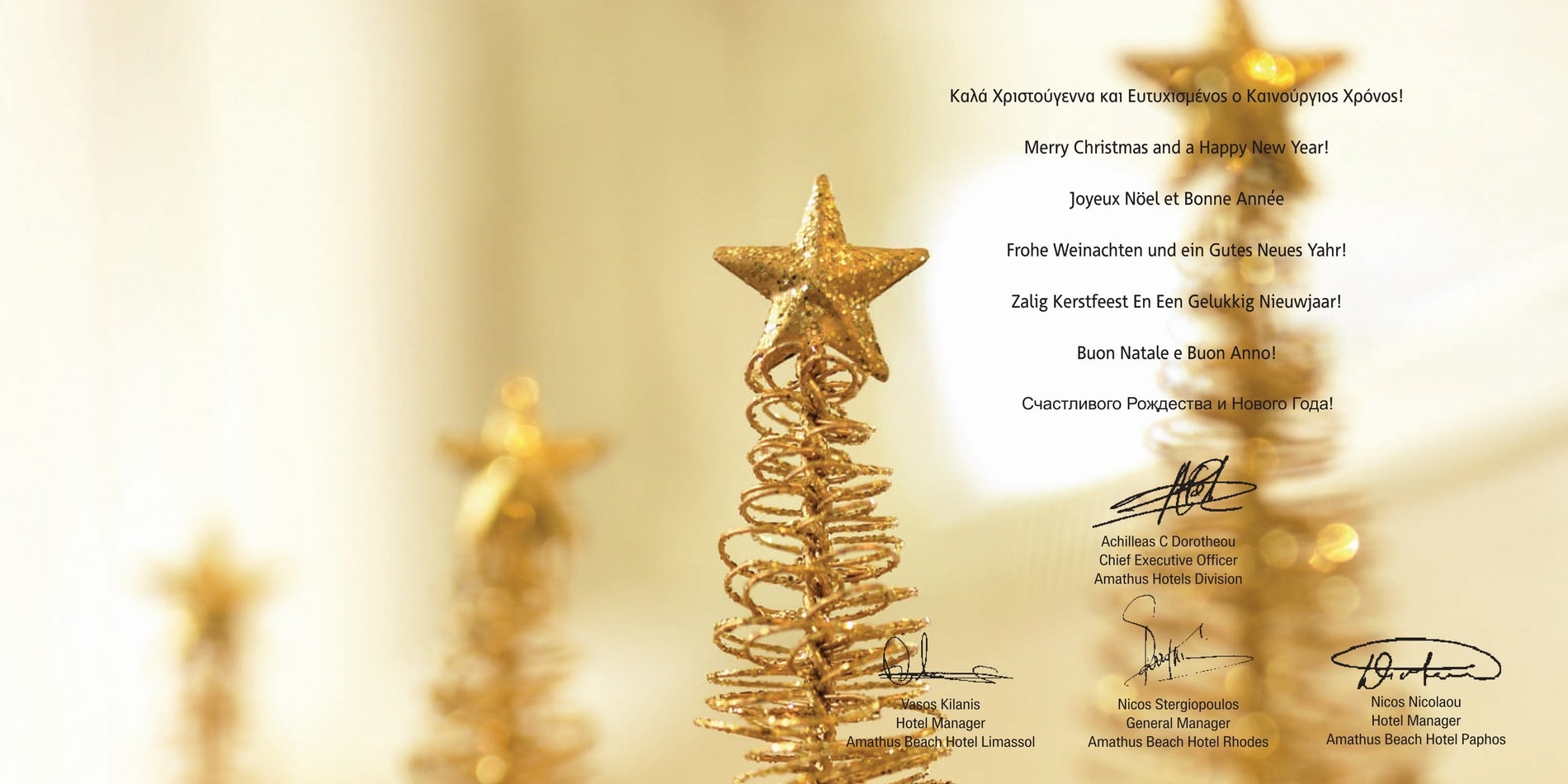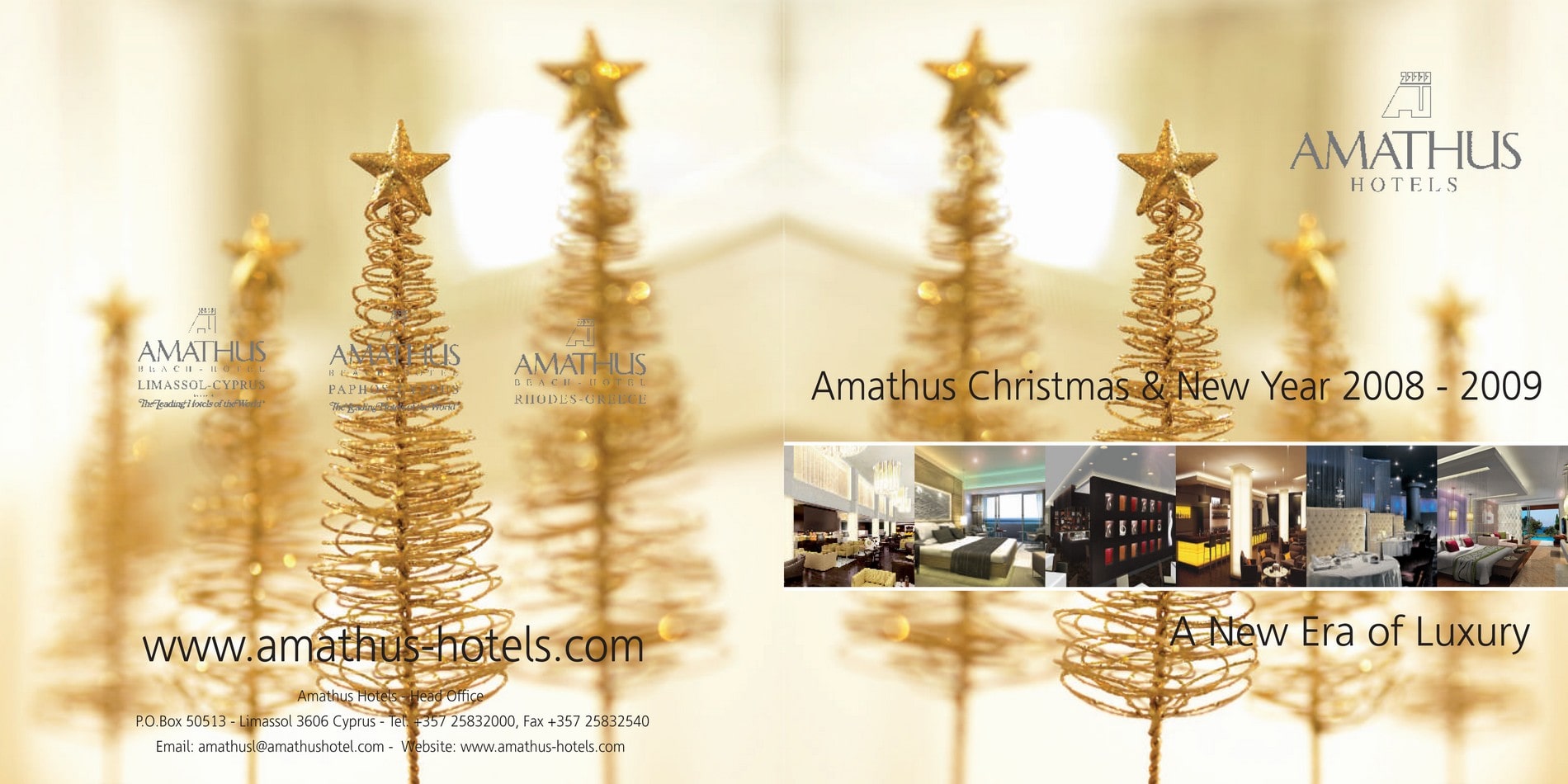 Design of a 2-panel, 4-page Christmas card featuring the holiday greetings of Amathus Hotels. Sent to past and new clients for the Christmas season, the card reflects the hotels’ major recent renovation through new photographic material, while being thoughtfully connected to the festive spirit of the holidays.