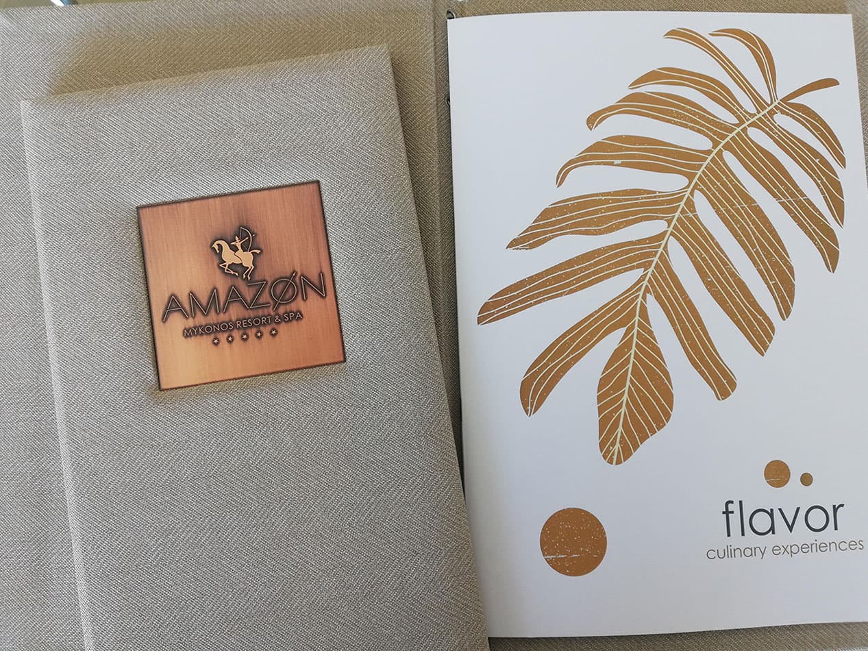 Premium menu design for Amazon Hotel in Mykonos, reflecting the brand’s refined aesthetic and upscale dining experience. The layout combines clean elegance with functional clarity, enhancing the visual presentation of the hotel’s culinary offerings and aligning seamlessly with its luxury identity.