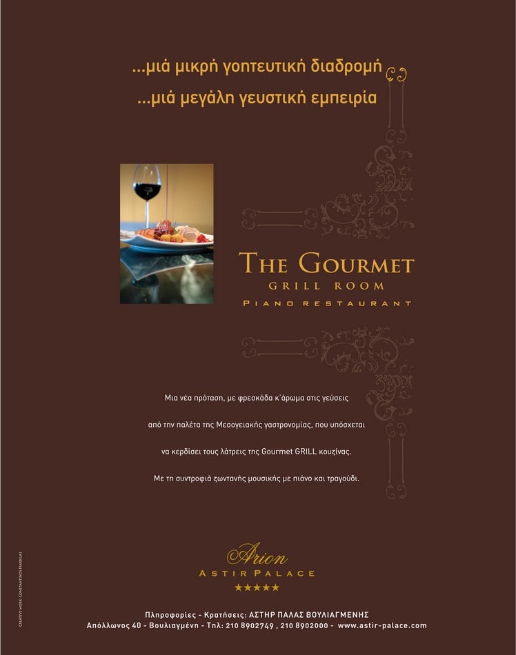 Design of an advertisement for Arion Astir Palace. Titled “A small charming journey, a great gastronomic experience”, the advertisement presents to the hotel’s audience the new Gourmet Grill Room, piano restaurant, which combines refined flavors with a captivating seaside view within the elegant spaces of Astir Palace.