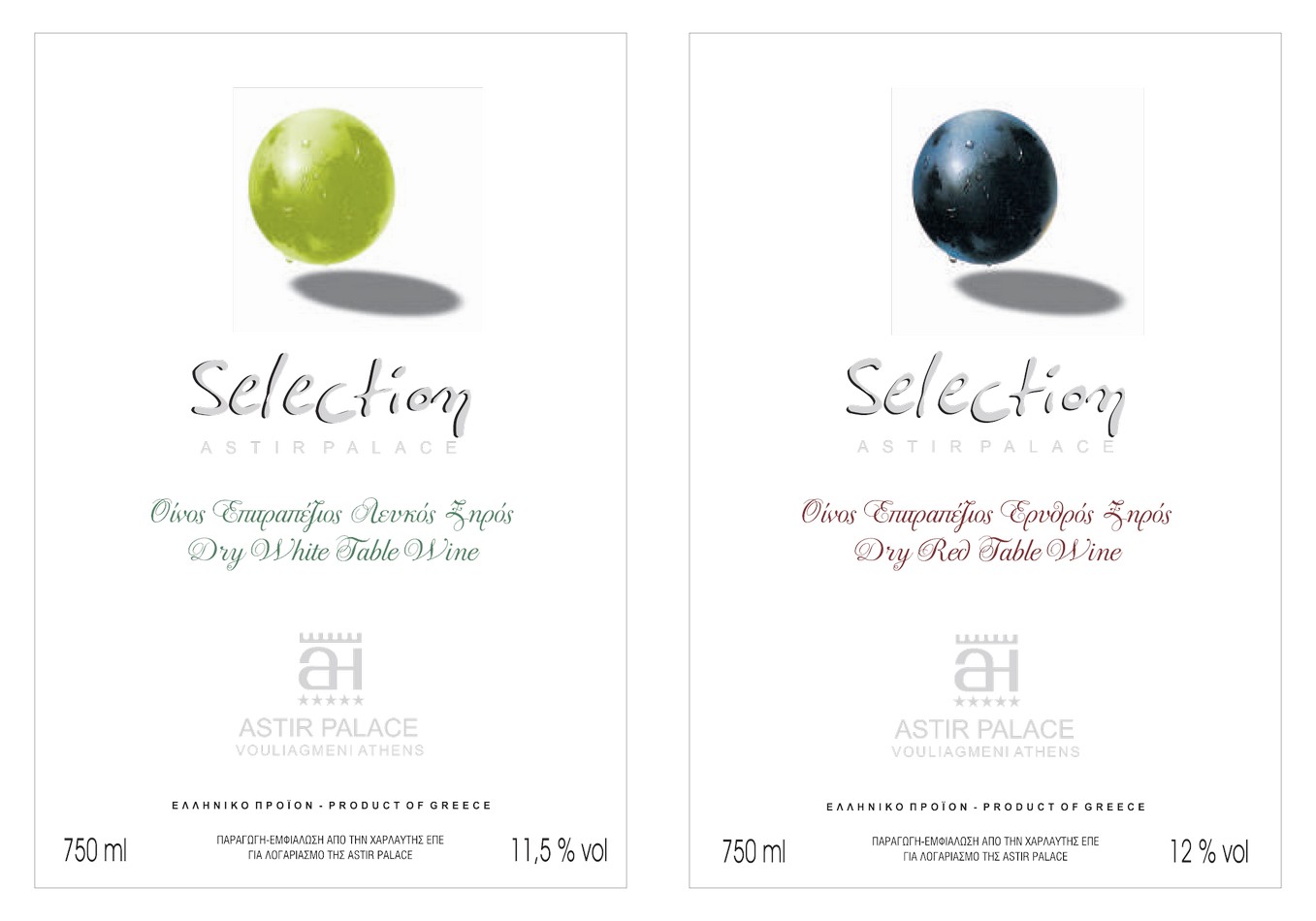 Creation of a wine label for Astir Palace Vouliagmeni. A minimal and refined design for both white and red wine. Each label reveals the wine’s color through a single grape berry illustrated on the front, wrapping elegantly around the bottle and providing the essential information about the origin and production of this Greek wine.