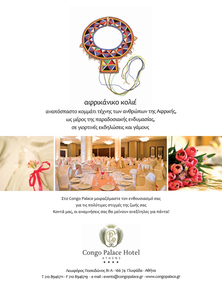 Design of an advertising print for Congo Palace. Using an African necklace, a piece of art and traditional attire worn in festive events and weddings, the hotel communicates through the advertisement its receptions and wedding services hosted in its halls, bringing elements of African traditions to life in Greece.
