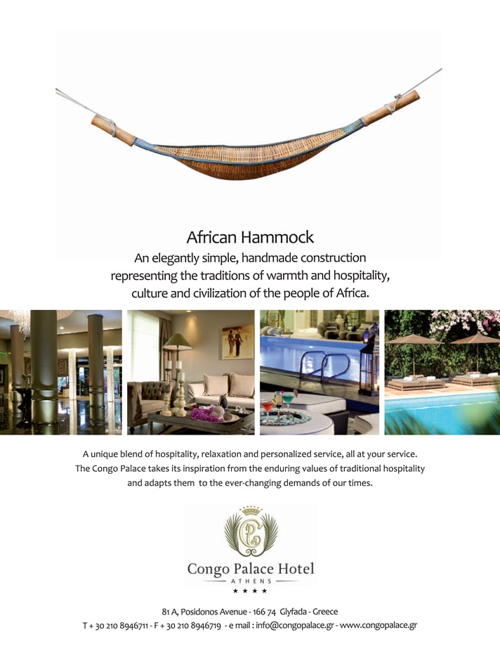 Design of an advertising print for Congo Palace Hotel, Athens. Titled African Hammock, the advertisement features an elegant handcrafted African hammock that highlights the traditional arts and culture of the African people, while reminding viewers that Congo Palace and its welcoming services are located in Greece.