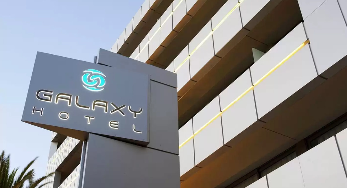 The typography that accompanies the symbol — thin, elegant and geometrically clean — emphasizes a sense of freshness and international prestige. The letters “GALAXY HOTEL” appear as if they belong to a modern observatory of the world — a place where earth meets sky, where the local meets the universal.