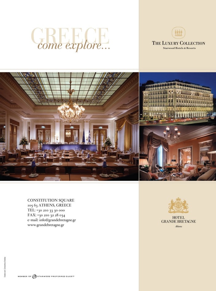 Advertising layout design following Starwood specifications for the conference facilities of the Grande Bretagne. With the message Greece, come explore, the hotel communicates in Greece and abroad its conference halls and the uniquely beautiful stay it offers.