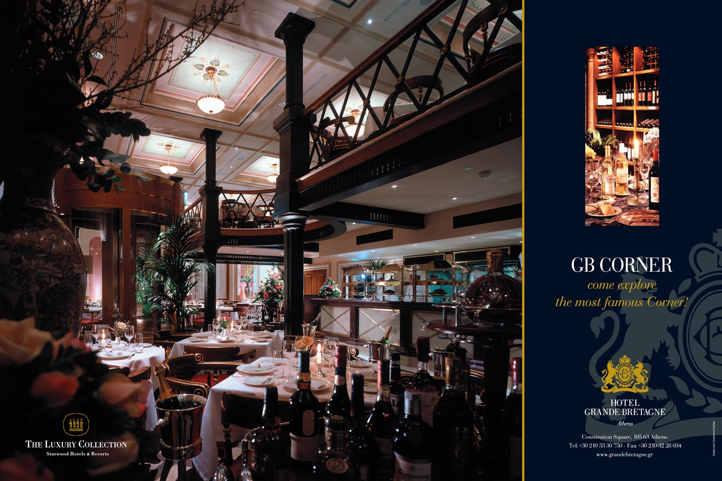 Full-spread advertising design for GB Corner, the iconic restaurant of Hotel Grande Bretagne. Located at the most prestigious corner of Athens, the campaign conveys a timeless sense of elegance, prestige and culinary excellence. The ad showcases a menu blending classic and modern flavors crafted by the hotel’s signature chefs, framed by the historic identity of the hotel’s renowned brand.
