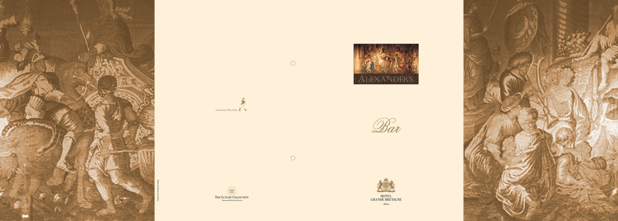 Luxury menu design for the world-renowned Alexander’s Bar at Hotel Grande Bretagne, Athens. Crafted as a collector’s piece, the menu features a special cord-tied binding and a 17th-century tapestry motif on the cover, blending heritage with high-end presentation. Inside, it showcases a curated selection of the finest spirits and rare liquors from around the globe. More than a drinks list, this menu is a work of art that reflects the bar’s award-winning status and timeless sophistication.