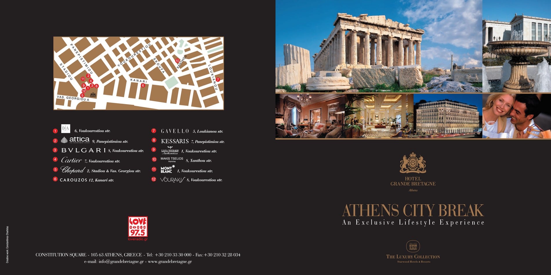 Luxury brochure design for Hotel Grande Bretagne, titled “Athens City Break”, created with a sleek black background and elegant gold line accents. This refined print piece features a custom-designed map highlighting exclusive boutiques, luxury stores, and premium shopping destinations within walking distance of the hotel. Tailored for short-stay guests seeking high-end experiences in central Athens, the brochure elegantly combines style and practicality offering a curated guide to the city’s finest offerings just steps from their suite.