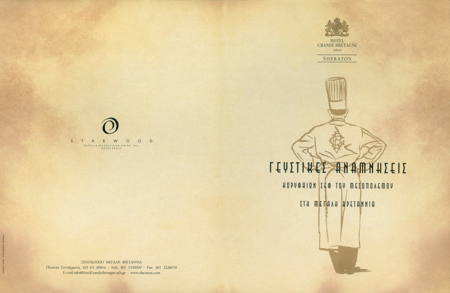 The final dinner of 2001, featuring the flavors, secrets and inspirations of the leading chefs of the interwar period, prepared exactly as they were at the time in the kitchens of Grande Bretagne. Design of the 2-panel menu in the hotel’s style, marking the closure and preparation for the major renovation of 2003. A legend is reborn. A tradition lives on.