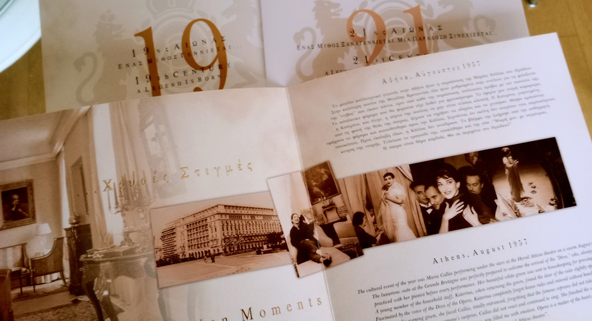 In the heart of Athens, Hotel Grande Bretagne stands as a living monument of Greek history, having hosted over the centuries kings, diplomats, artists and figures who shaped the cultural and political identity of the country. The three collectible Golden Moments brochures, dedicated to the 19th, 20th and 21st centuries, bring this rich heritage to life through a narrative that combines elegance, memory and high-level design. Each brochure is crafted with great attention to detail, featuring refined typography, sepia-toned photography and gold accents that convey the grandeur of the era it represents, making them not only narrative pieces but also aesthetic works of art.