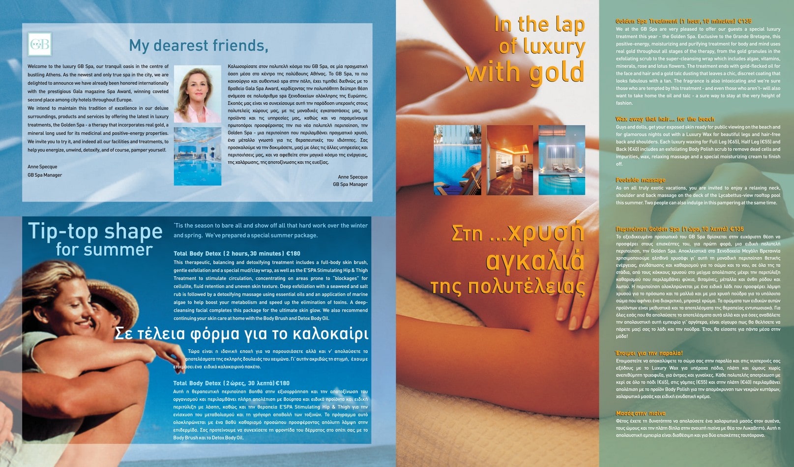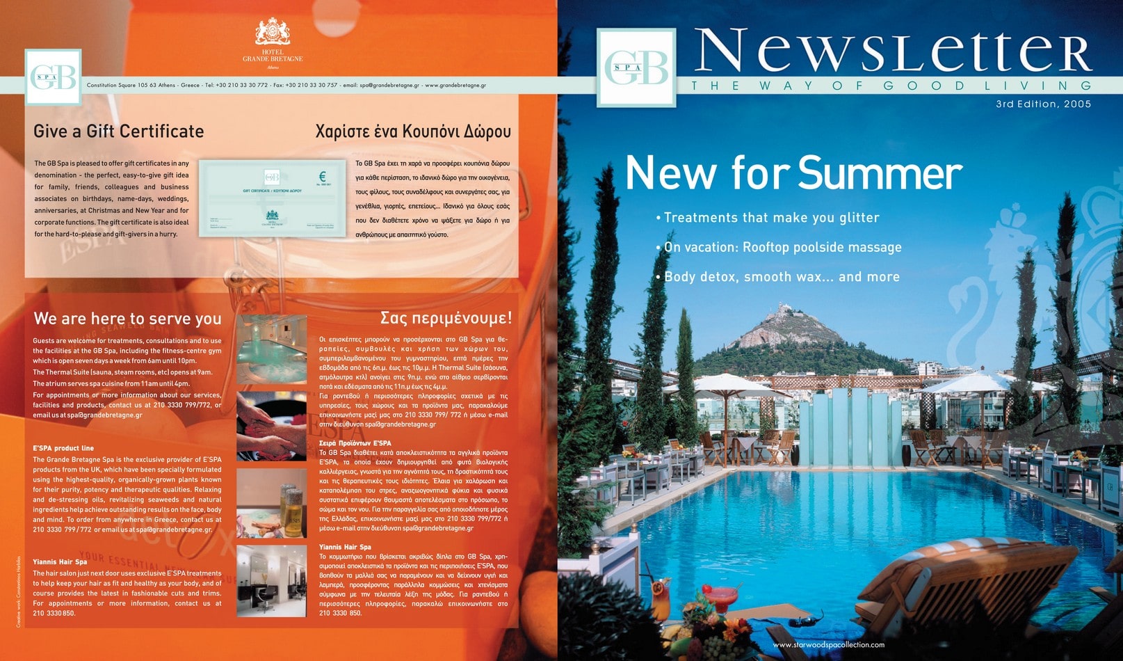 Design and creation of a 3-month, 8-page newsletter for the GB Spa of the Grande Bretagne hotel, titled The way of good living. Useful tips, treatments and cosmetics for the male and female face and body offer a distinct and unmatched sense of luxury, when combined with the exceptionally elegant wellness spaces of the GB Spa.