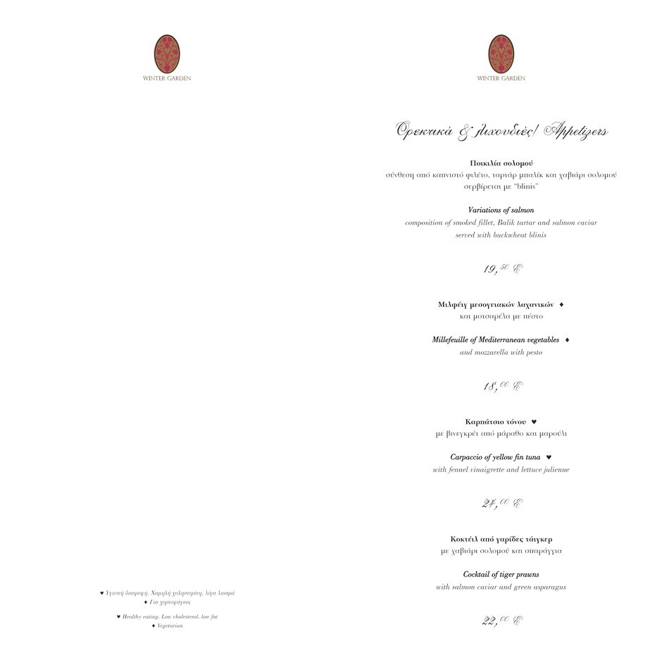 Menu design for the Winter Garden of the Grande Bretagne. The logo – winter garden, inspired by the name, along with the interior tapestry, dress the menu in a strict, classic style, in harmony with the character of the Winter Garden. This multi – page menu features gastronomic surprises prepared by the hotel’s chefs for both returning and new guests, within the spaces of unmatched aesthetics of the Grande Bretagne.