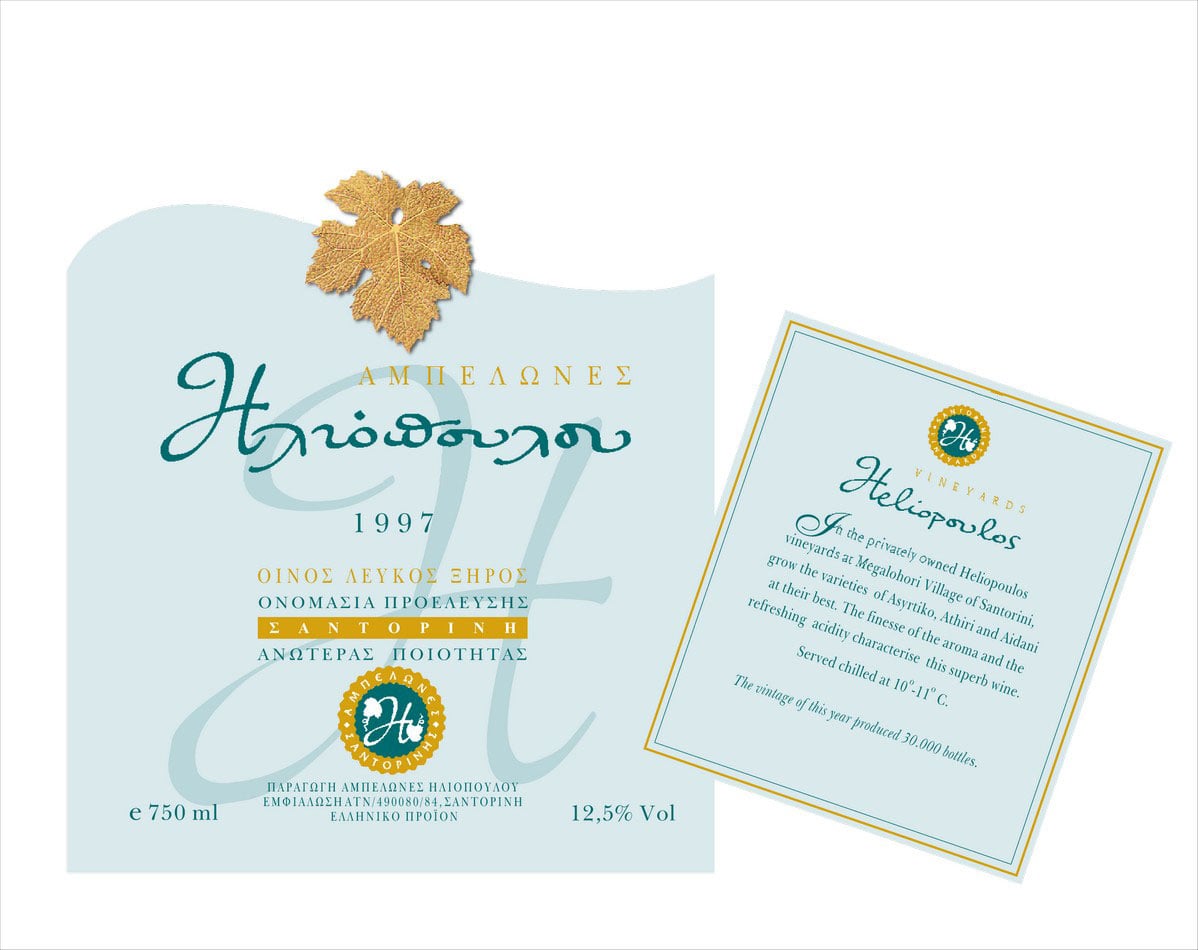 Label design for a white wine by Iliopoulos Vineyards in Santorini, combining elegance and regional symbolism. The label features a gold embossed vine leaf as a tribute to the vineyard’s heritage and craftsmanship. A curved upper edge evokes the wave of the nearby Aegean Sea, visually linking the wine to its unique island terroir. Designed to reflect both luxury and authenticity, the label enhances shelf appeal and reinforces the wine’s origin from one of Greece’s most iconic viticultural landscapes.