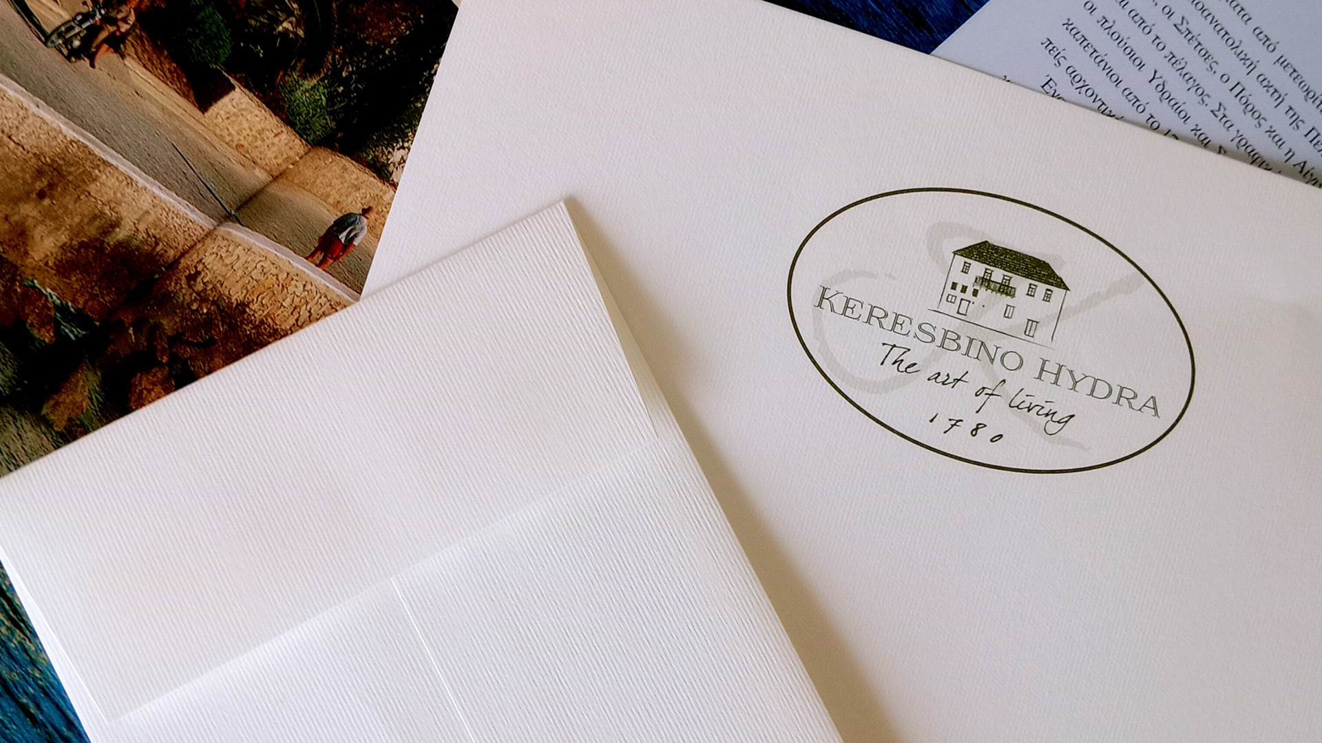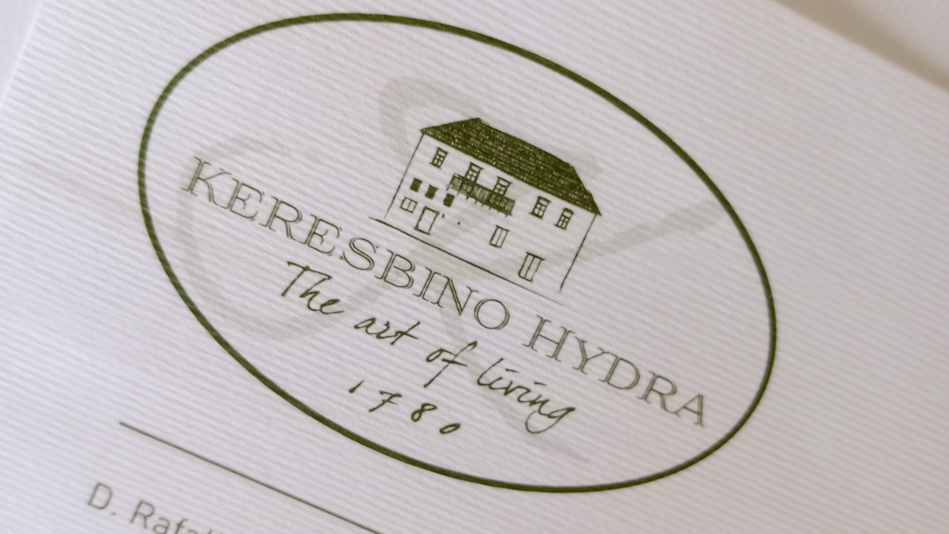 The addition of the year 1780, discreet yet defining, functions as a chronicle: it does not simply tell us when the house was built. It places us within the historical continuum of Hydra – an island that does not look back out of nostalgia, but out of respect. The very form of the logo, set within a subtle elliptical frame, recalls an old ticket stamp or the seal of noble correspondence – as if it has come from another era, yet fits perfectly into the present.