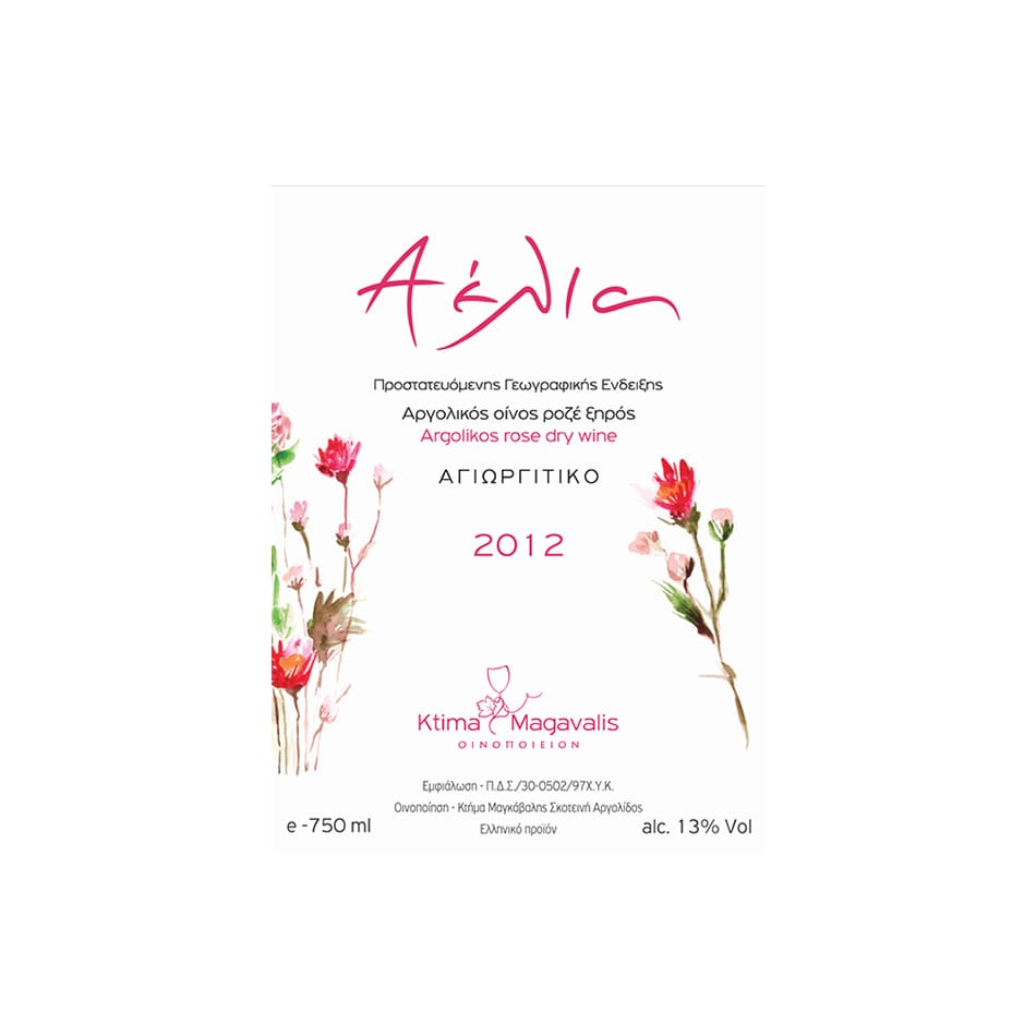 Rosé wine label design titled “Aelia”, which in Homeric language refers to the energy that comes from the sun. A fine wine with floral aromas from the Argolic land. Sunlit bouquets of flowers in rosé shades lend their freshness to the visual concept of the label.