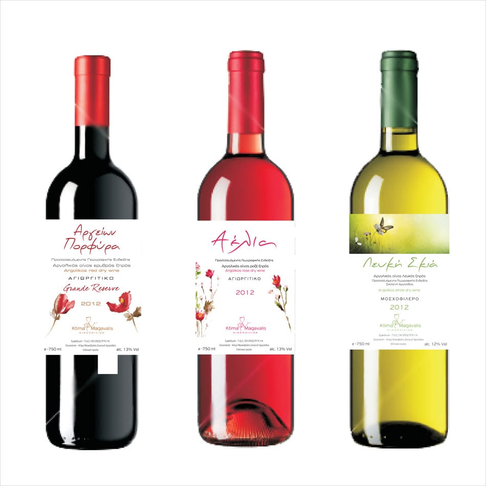 Wine label design. Three different wines titled Argeion, Porfyra, Aelia and Lefki Skia, in red, rosé and white, are dressed with labels that define their origin and include other essential elements required for their promotion in the market.