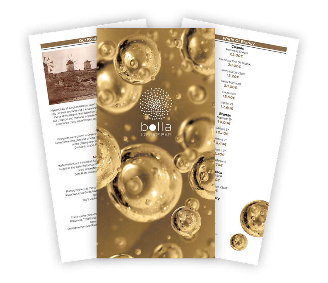 Stylish menu design for Bolla Lounge Bar in Mykonos, combining modern aesthetics with a relaxed yet upscale vibe. The layout is crafted to enhance the guest experience, showcasing signature cocktails and bar selections through a clean, vibrant, and visually engaging design perfectly aligned with the bar’s contemporary island identity.