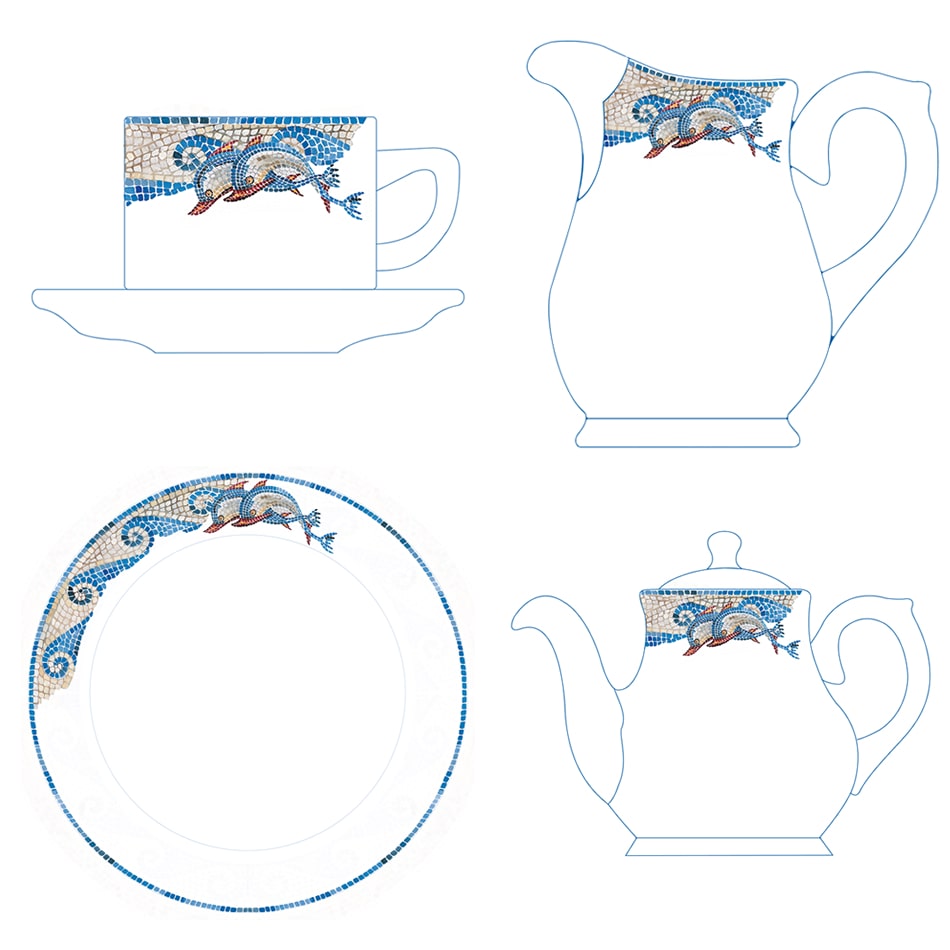 Design – creation of a complete tableware collection, featuring the dolphins of Delos as the visual theme, for Mykonos Grand Resort! The design includes Churchill porcelain pieces, fired in London, suitable for all hours of the day, starting from breakfast and lunch and ending with dinner! Pitchers, cups and plates, designed in watercolor, with a theme inspired by a puzzle of dolphins, as seen from the hotel facing Delos.