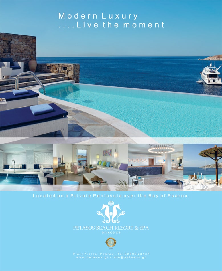 Advertising layout design for Petasos Beach Resort & Spa in Mykonos.