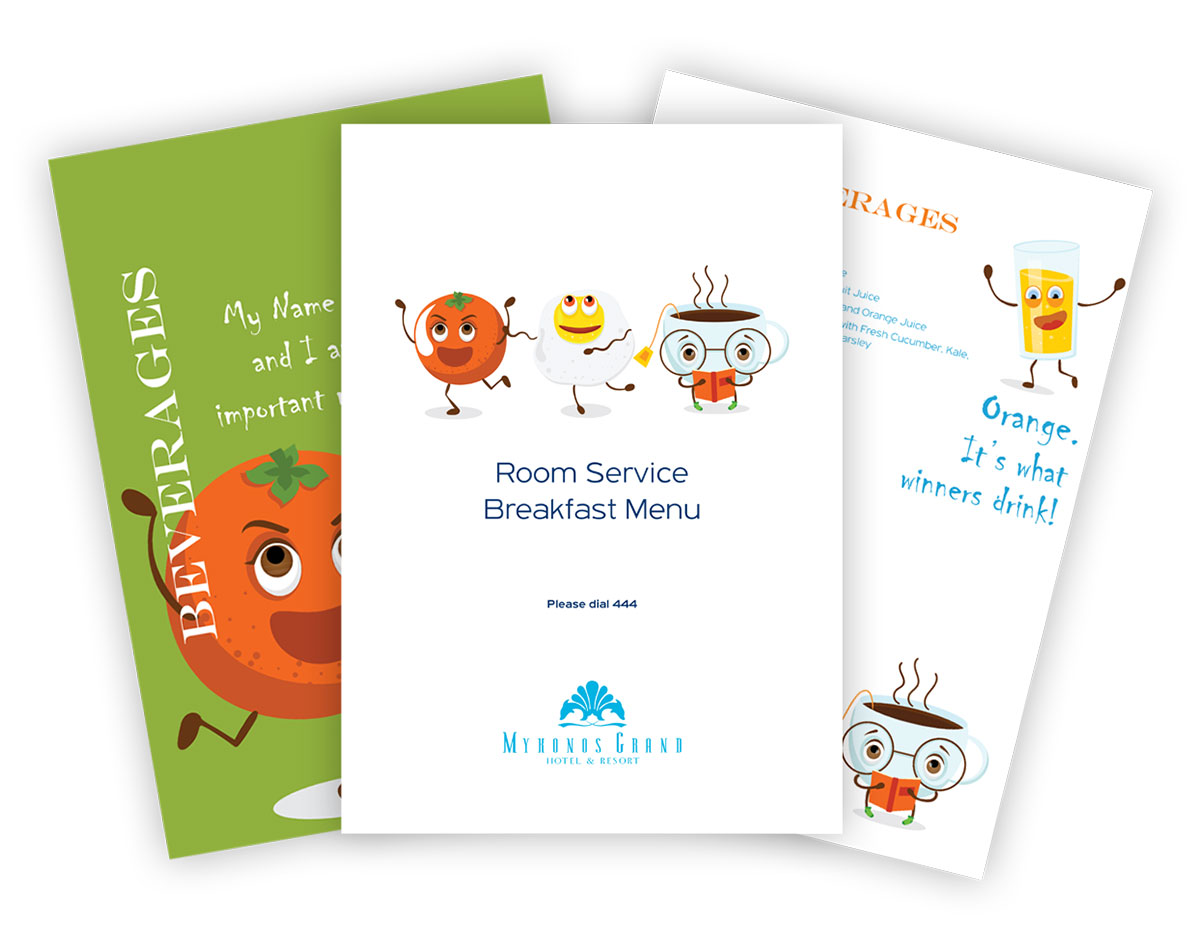 Room Service – Breakfast menu design for Mykonos Grand Hotel.