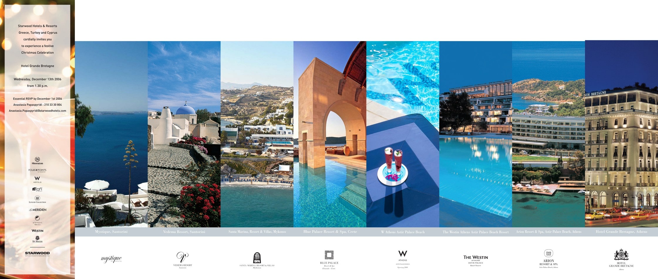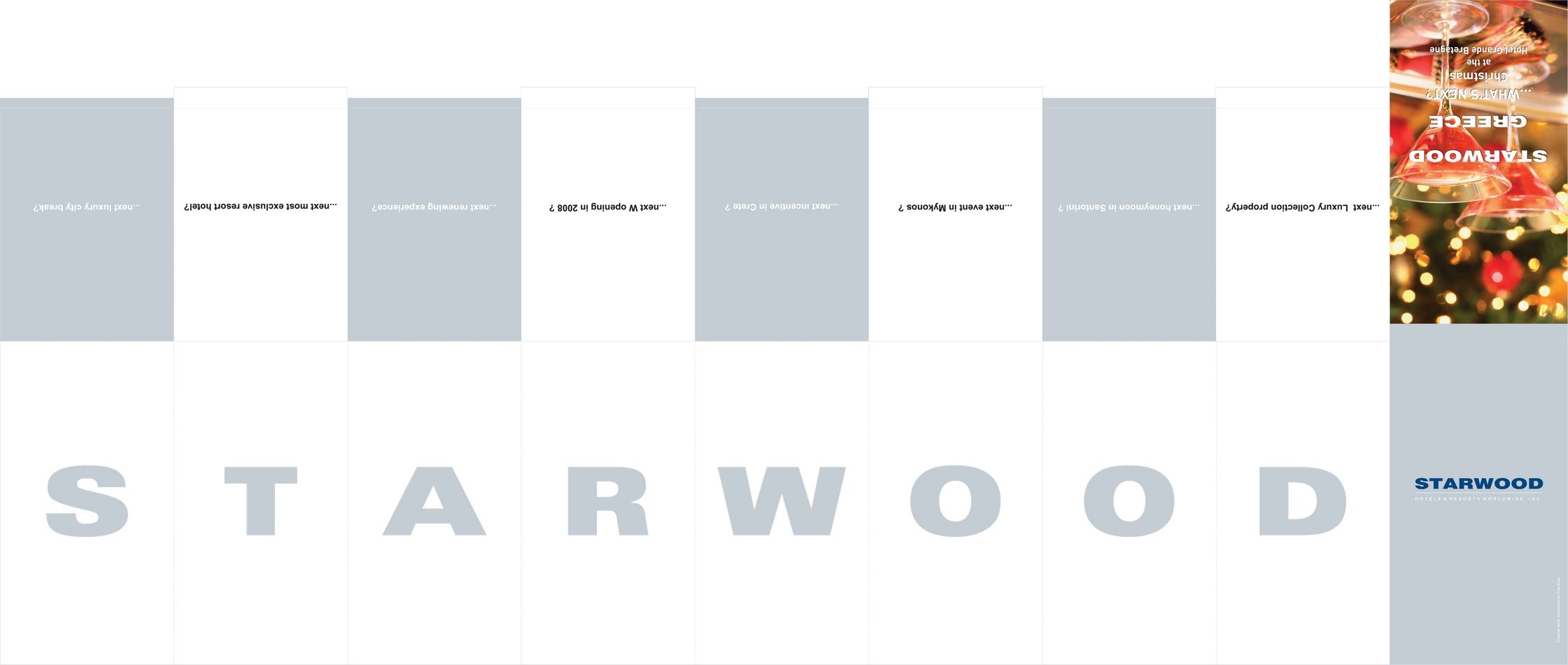 Invitation design for Starwood Hotels & Resorts Greece. Design – creation of a multi – fold Christmas invitation with a distinctive opening for the Grande Bretagne Hotel and all Starwood Hotels & Resorts in Greece! A narrow fan – style multi – fold Christmas invitation, where each opening reveals a Starwood hotel along with its corresponding text – slogan and photographic material. The purpose of the invitation is to communicate the new Starwood Hotels in Greece to the invited clientele.