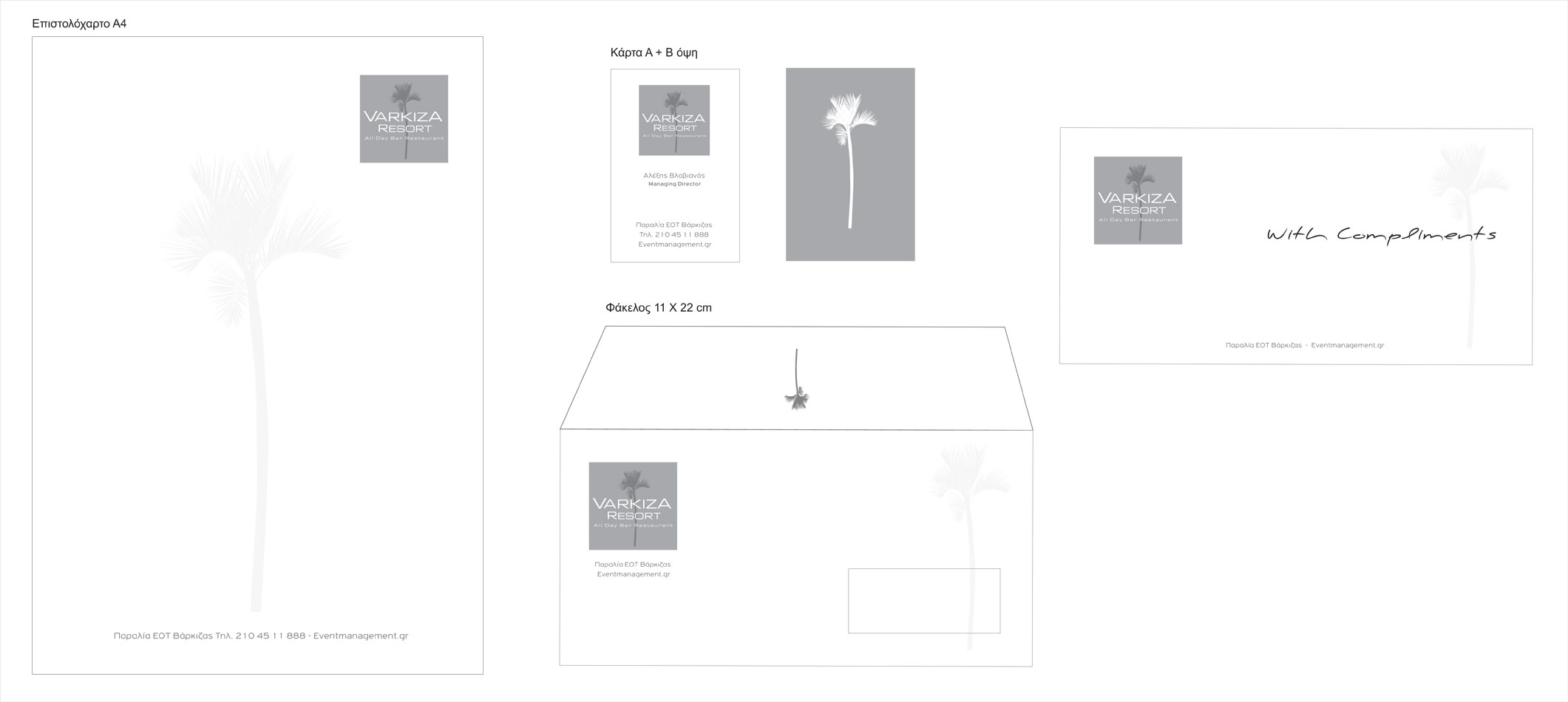 Corporate identity design for Varkiza Resort. The palm tree accompanies the corporate identity in shades of grey, giving a minimalist and modern feel to the spaces of the All Day Café Bar in Varkiza, located in the heart of 25 palm trees.