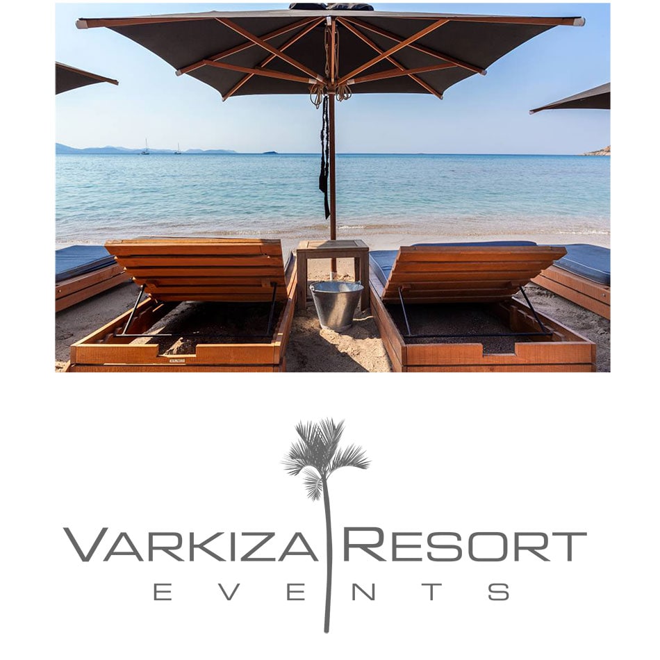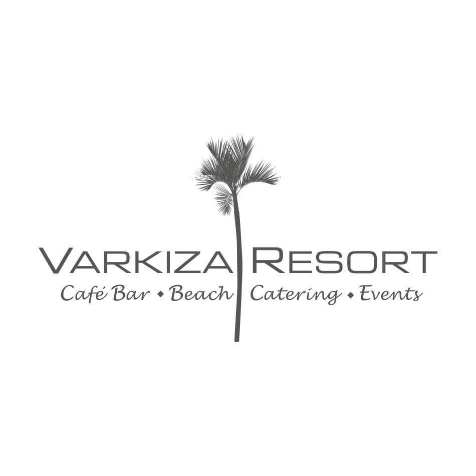 Logo design for Varkiza Resort. The inspiration behind the logo design for this impressive Cafe Bar on the beach of Varkiza came from the towering palm trees that surround it. One of them embraces the logo, giving a tropical character to the Cafe Bar, while at the same time the other services of Varkiza Resort are highlighted in italic lettering in the areas of Catering and Events.