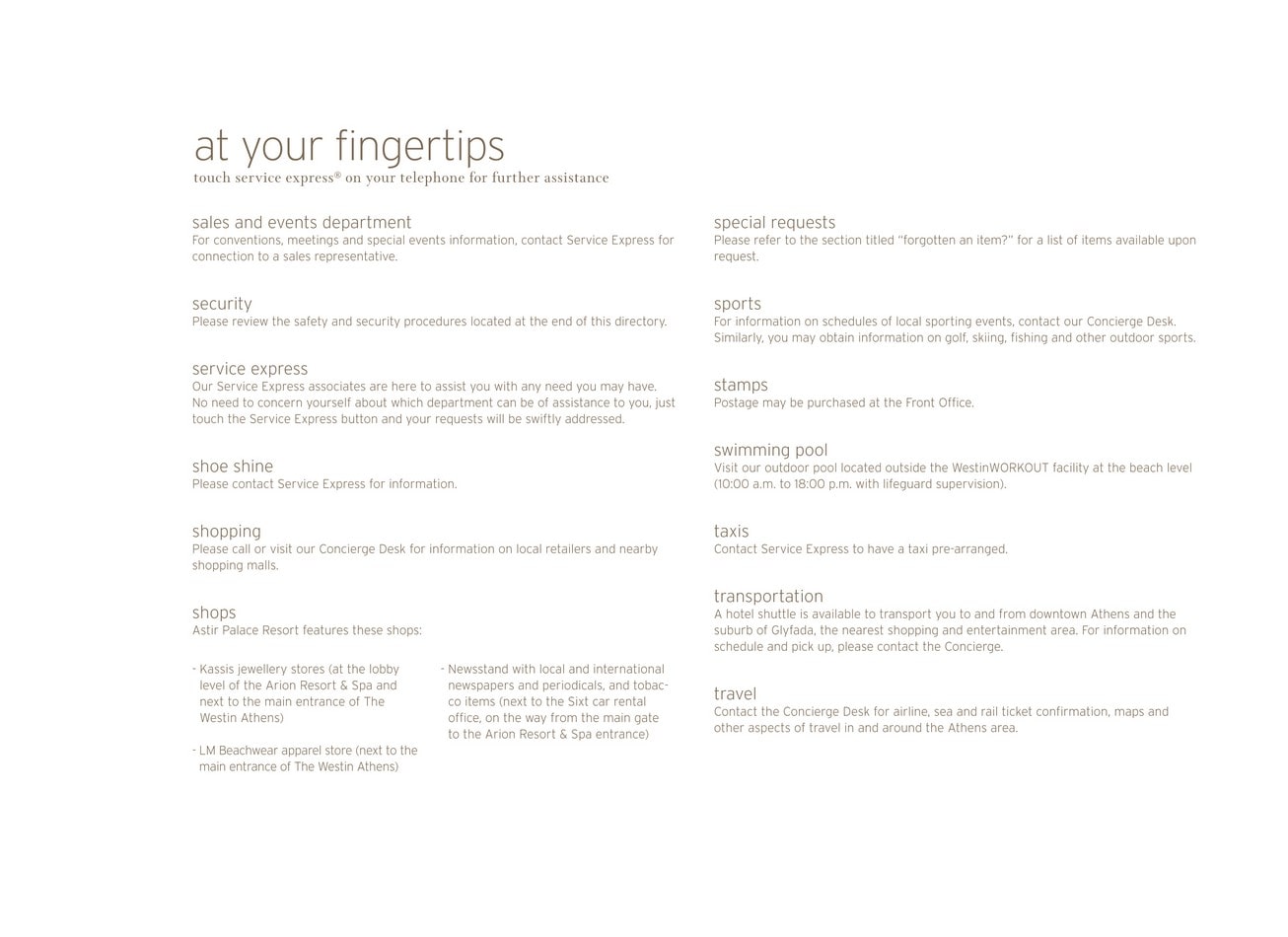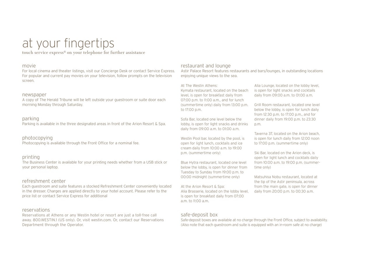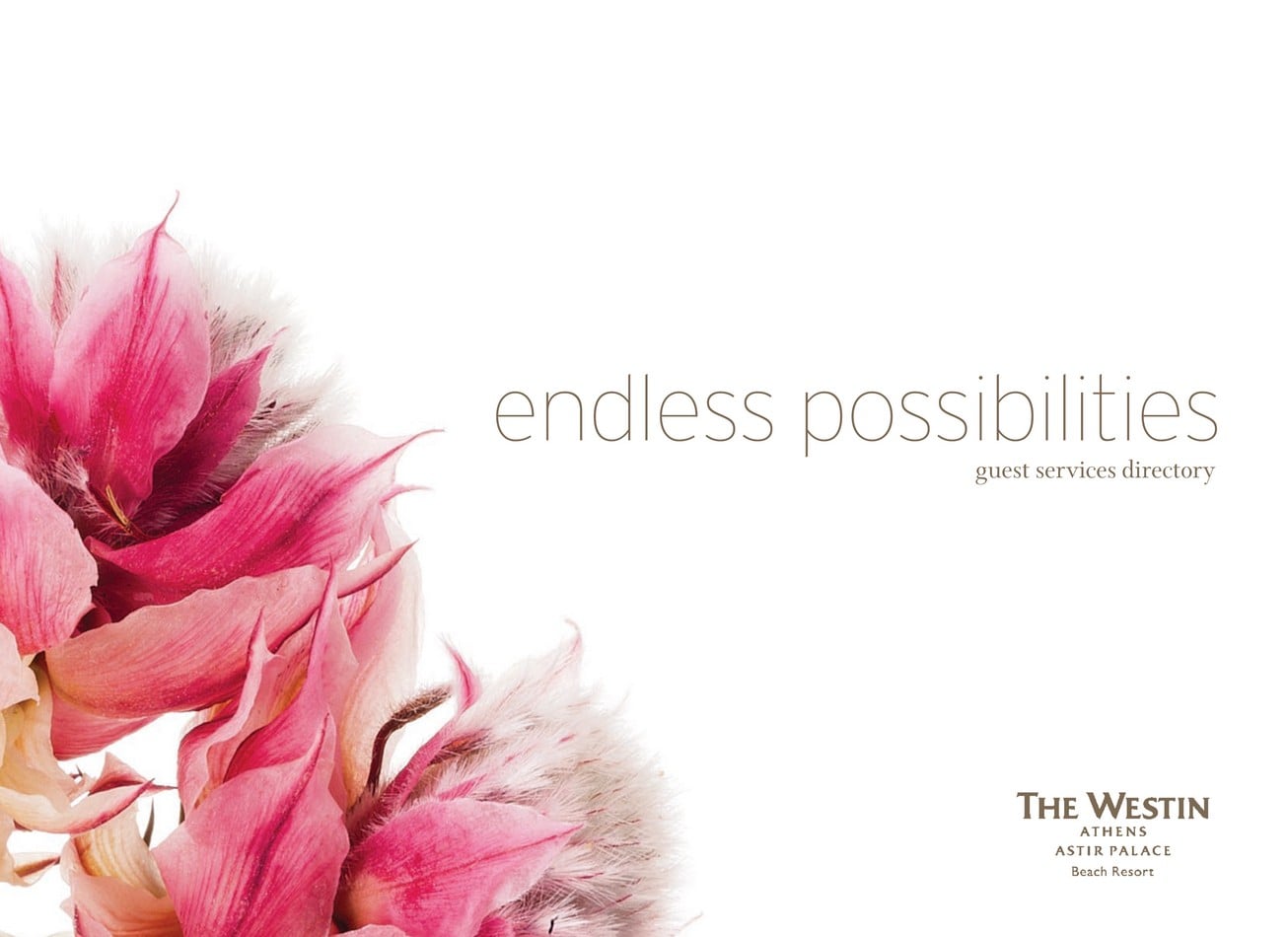 Guest Service Directory design for The Westin Athens at Astir Palace, developed in accordance with Starwood brand standards. Titled “Endless Possibilities,” the directory showcases the extensive range of experiences available within the resort—offering guests a curated guide to luxurious living. From wellness and recreation to fine dining and exclusive services, the design reflects the brand’s commitment to comfort, inspiration, and elevated hospitality.