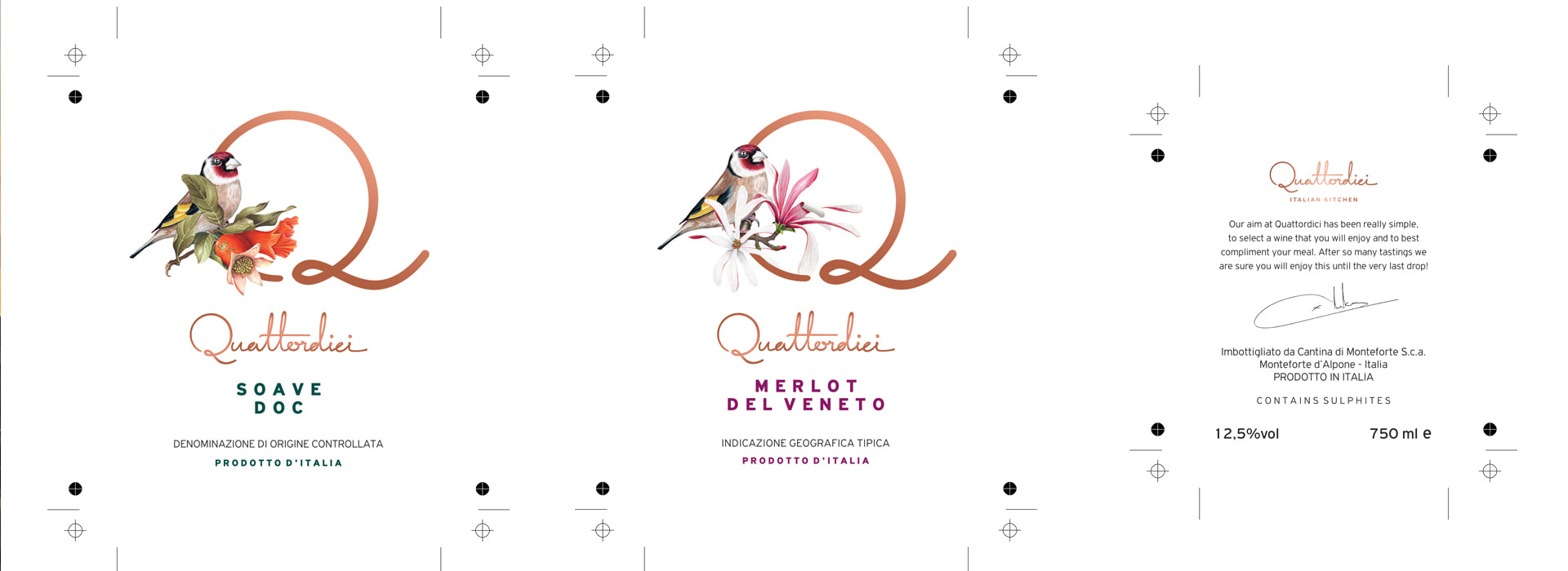 The core design element is the bold, graphic “Q,” which functions as a visual frame. It is not merely the initial of Quattordici, but an organic form that embraces a different bird and flower in each edition. In the Merlot, the palette revolves around red and brown — colors of the earth and ripe fruit. In the Soave, the result is lighter, with green leaves and pomegranate blossoms, evoking freshness and a spring – like aroma.