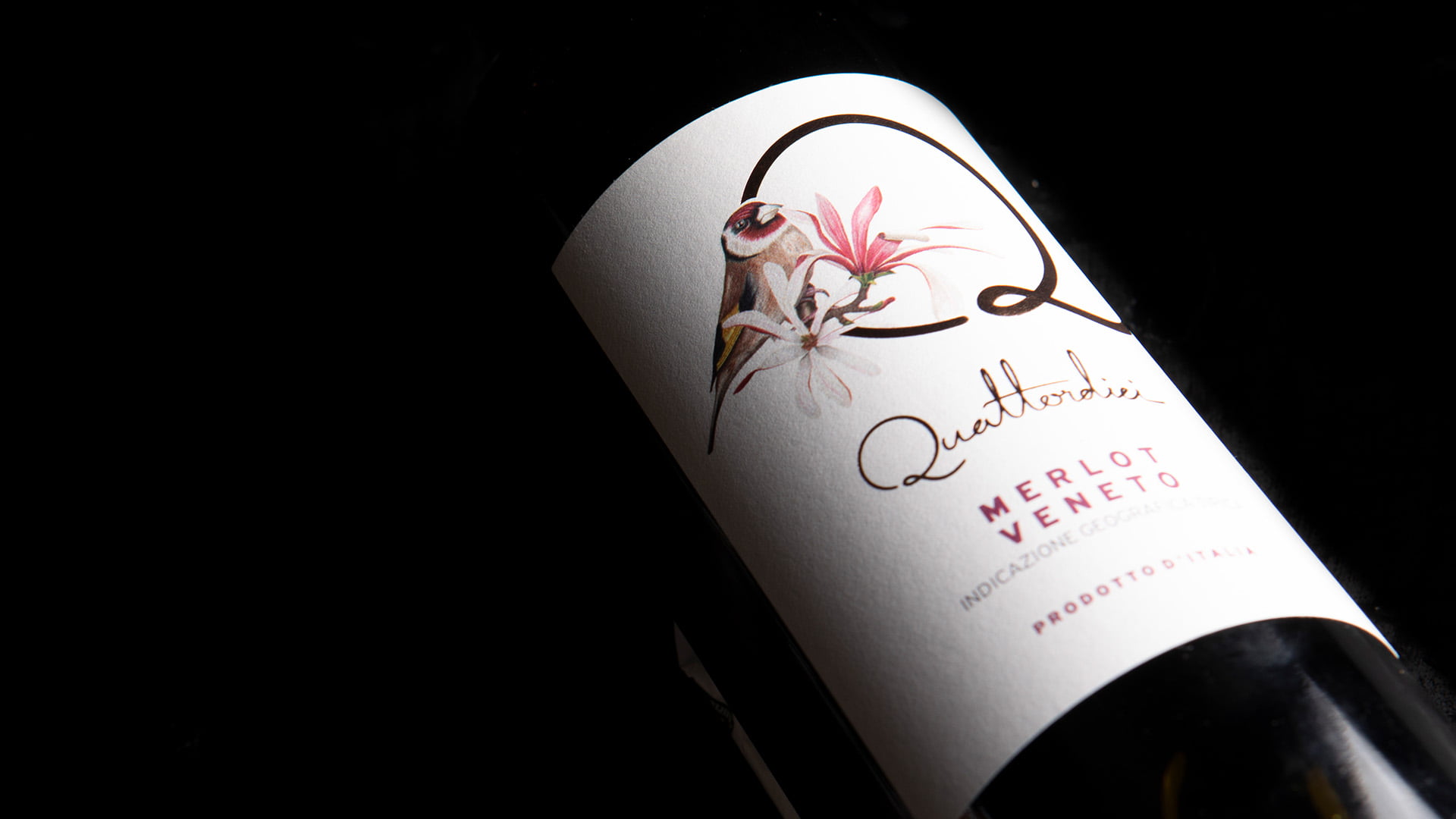 The core design element is the bold, graphic “Q,” which functions as a visual frame. It is not merely the initial of Quattordici, but an organic form that embraces a different bird and flower in each edition. In the Merlot, the palette revolves around red and brown — colors of the earth and ripe fruit. In the Soave, the result is lighter, with green leaves and pomegranate blossoms, evoking freshness and a spring – like aroma.