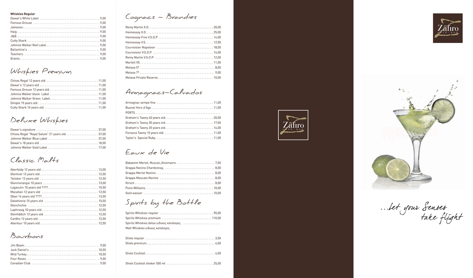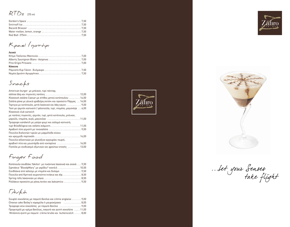 Four-panel drink menu design for Zafiro Experience, titled Let Your Senses Take Flight. Created for the café located in the Second Attiko Alsos, the menu blends visual elegance with user-friendly structure. It guides guests through a flavorful journey of beverages, presenting each selection with clarity and style to elevate the overall tasting experience.